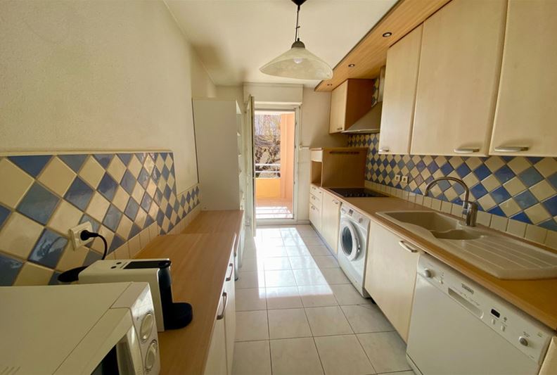 VENCE, downtown, in a high-end residence with a swimming pool, tennis courts, and a caretaker, spacious apartment comprising four main rooms converted into three: entrance, large corner double living room, separate equipped kitchen, beautiful bedroom with its own shower room/WC, and a second bedroom, bathroom, WC, and plenty of closets. Large corner terrace and double garage of 30 m².