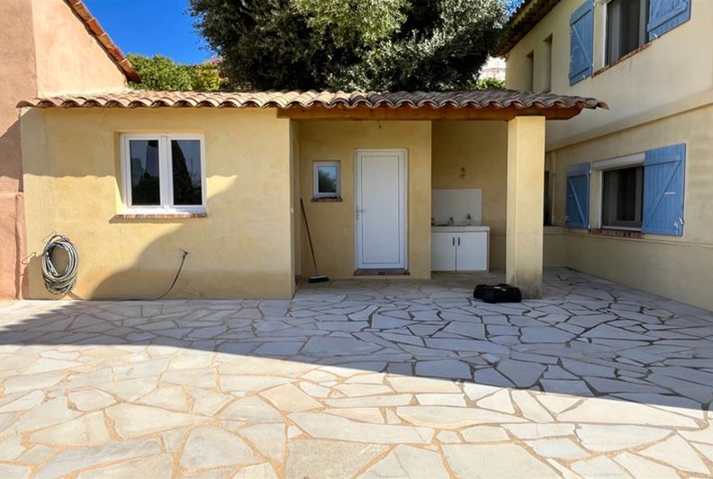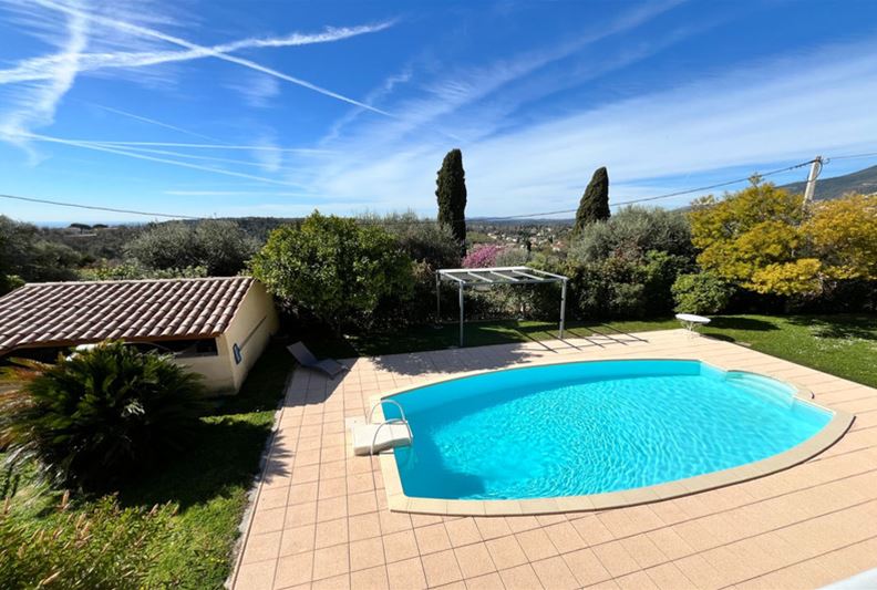 VENCE, close to the town center, in an elevated position with an unobstructed view extending to the sea. The villa is laid out as follows: On the main level, entrance, living room with fireplace, separate fitted kitchen, hallway with independent toilet and hand basin, two bedrooms with built-in wardrobes, a shower room, and a dressing room. A 21 m² terrace with a lovely clear view of the sea, plus a summer kitchen. On the lower level, two bedrooms with built-in wardrobes, a bathroom, a toilet, a dressing room, a TV lounge, and a laundry room. A cellar, a storage room, a workshop, and a boiler room. Outside, a large swimming pool. An annex with a toilet and storage area. A carport for two vehicles.