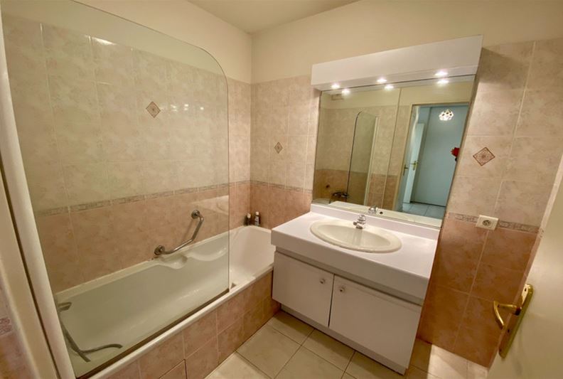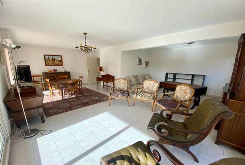 VENCE, downtown, in a high-end residence with a swimming pool, tennis courts, and a caretaker, spacious apartment comprising four main rooms converted into three: entrance, large corner double living room, separate equipped kitchen, beautiful bedroom with its own shower room/WC, and a second bedroom, bathroom, WC, and plenty of closets. Large corner terrace and double garage of 30 m².