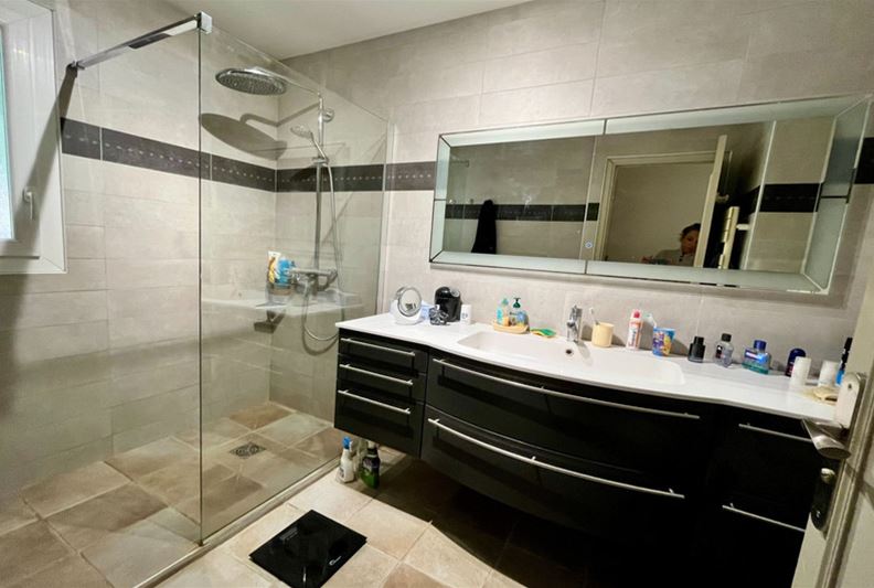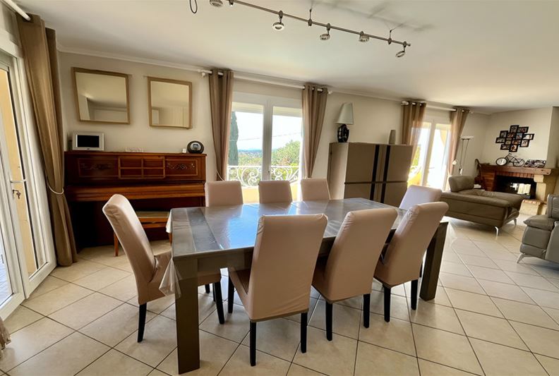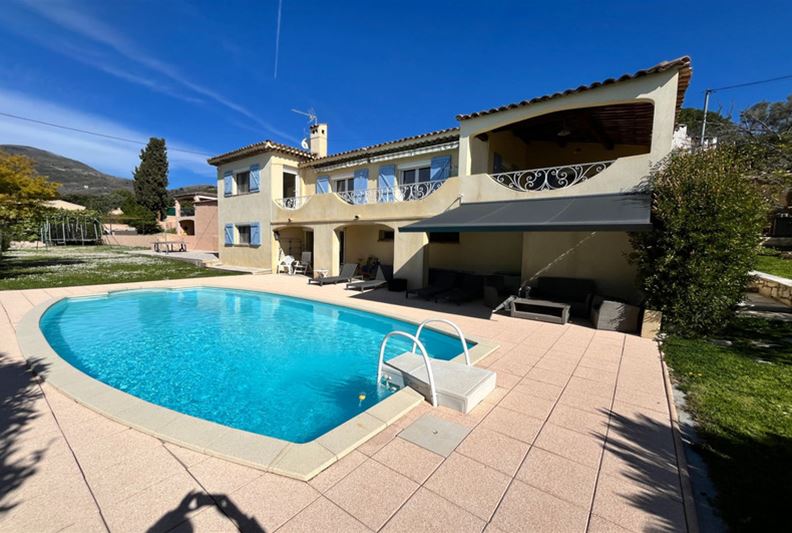 VENCE, close to the town center, in an elevated position with an unobstructed view extending to the sea. The villa is laid out as follows: On the main level, entrance, living room with fireplace, separate fitted kitchen, hallway with independent toilet and hand basin, two bedrooms with built-in wardrobes, a shower room, and a dressing room. A 21 m² terrace with a lovely clear view of the sea, plus a summer kitchen. On the lower level, two bedrooms with built-in wardrobes, a bathroom, a toilet, a dressing room, a TV lounge, and a laundry room. A cellar, a storage room, a workshop, and a boiler room. Outside, a large swimming pool. An annex with a toilet and storage area. A carport for two vehicles.